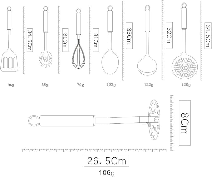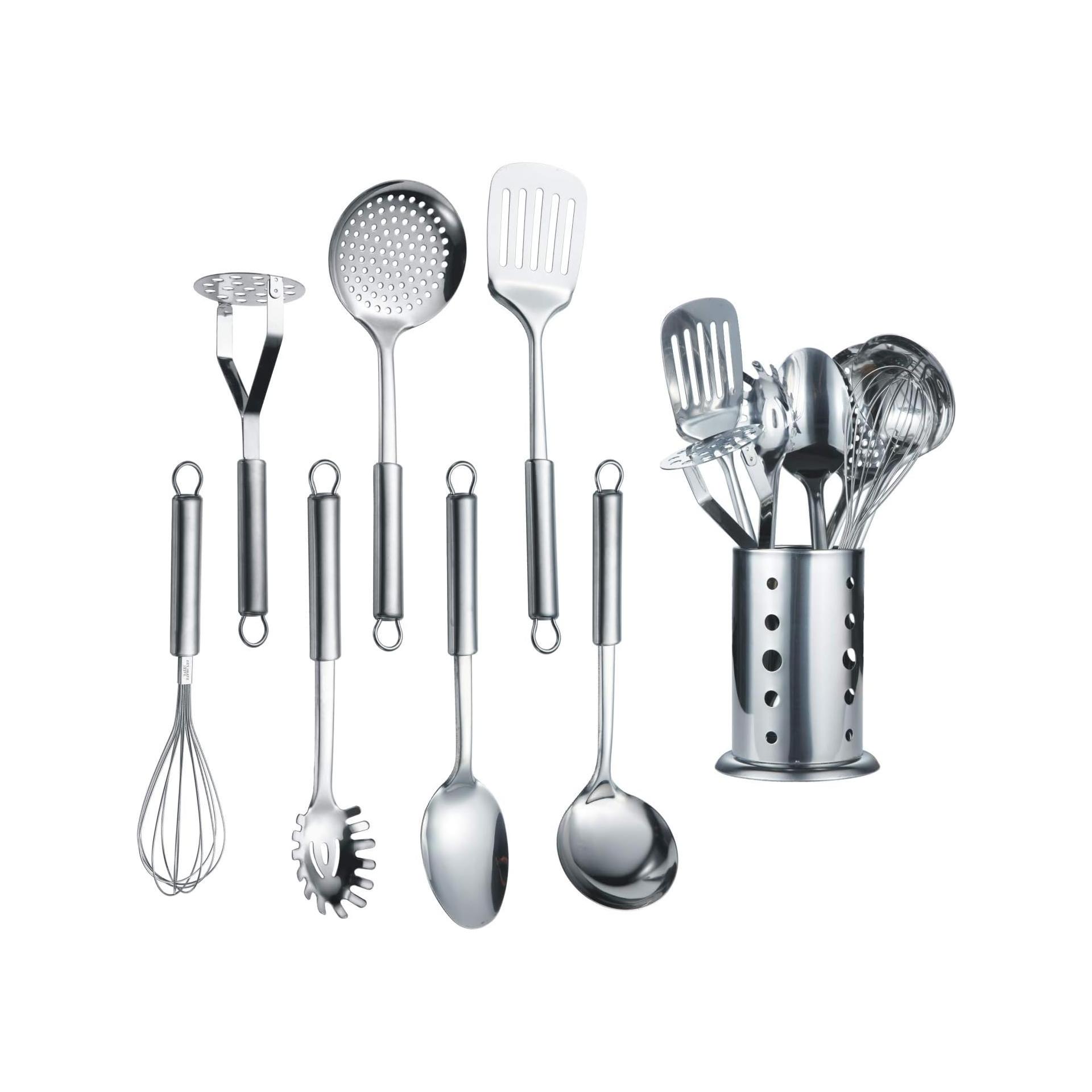 Verleihen Sie Ihrer Küche einen Hauch von Stil und Funktionalität mit diesem 7-teiligen Küchenhelfer-Set aus hochwertigem Edelstahl. Das Set enthält alles, was Sie für den täglichen Kochbedarf benötigen: Kochlöffel, Schöpfkelle, Schaumlöffel, Servierlöffel, Spaghettiheber, Kartoffelstampfer – alle ordentlich aufbewahrt in einem stabilen Küchenständer.